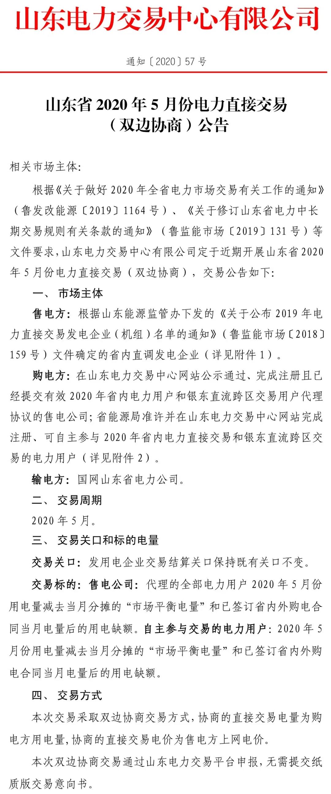 根據《關于做好2020年全省電力市場交易有關工作的通知》(魯發改能源〔2019〕1164號)、《關于修訂山東省電力中長期交易規則有關條款的通知》(魯監能市場〔2019〕131號)等文件要求,山東電力交易中心有限公司定于近期開展山東省2020年5月份電力直接交易(雙邊協商),交易公告如下:
